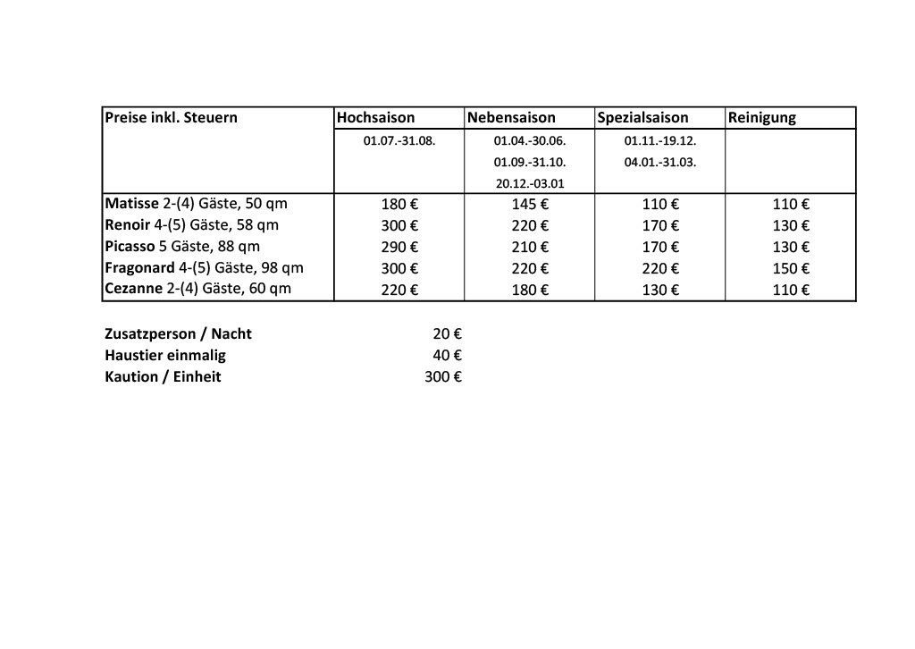 Mit der Reservierung ist eine Anzahlung von 50 % des Mietpreises fällig. Einen Monat vor Ankunft ist der restliche Betrag fällig. Es wird eine Kaution von 300 EUR pro Apartment erhoben.